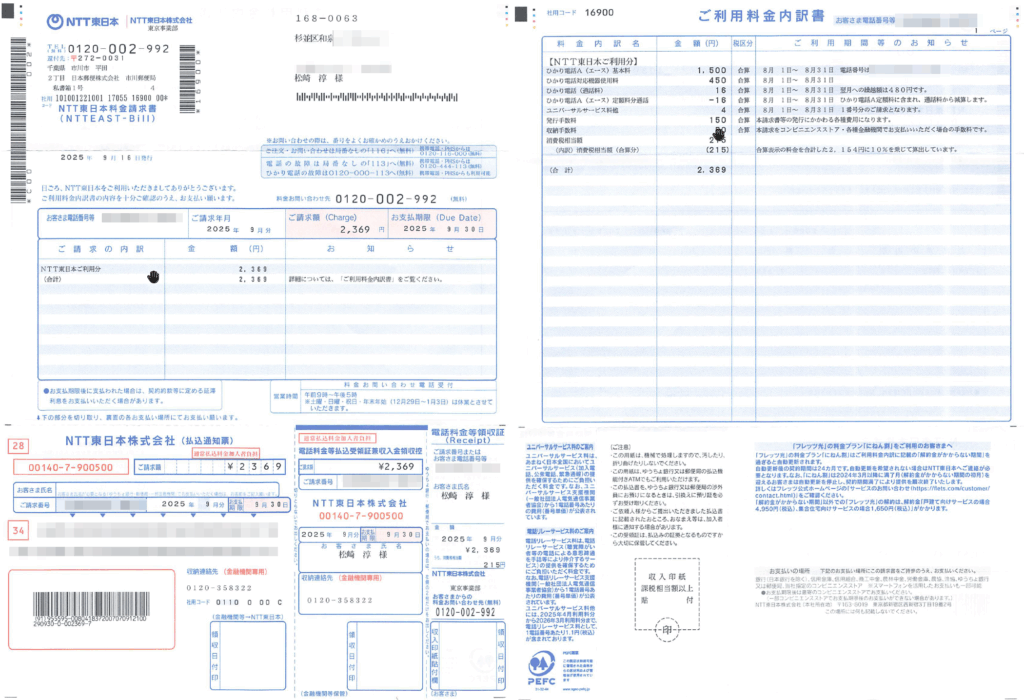 同社の代金支払い方法は、現状、3つあり、❶は「料金請求書」、❷は「口座振替のお知らせ」が契約者住所に届きます(❷は書類発行なし)。
