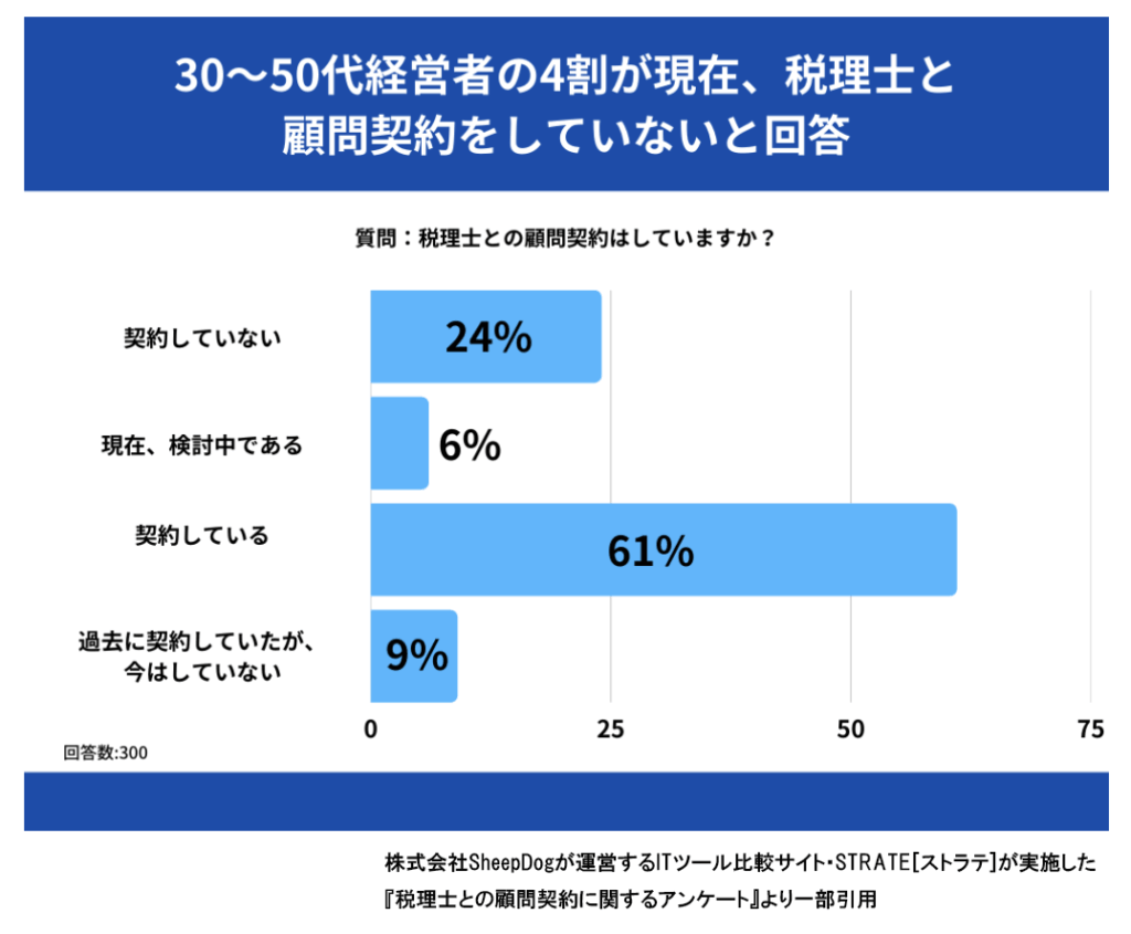 ㈱SheepDog社が運営する比較サイトにて、全国の30~59歳の経営者・役員300人を対象に2023年に行った「税理士との顧問契約に関するアンケート」によると、約4割弱は税理士と顧問契約をしていないという結果がでています。